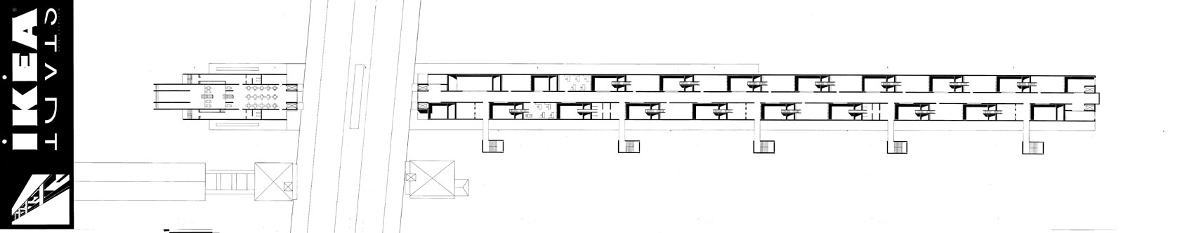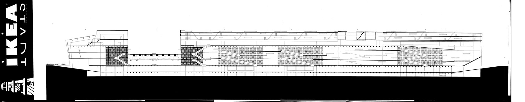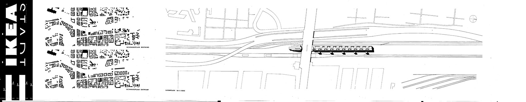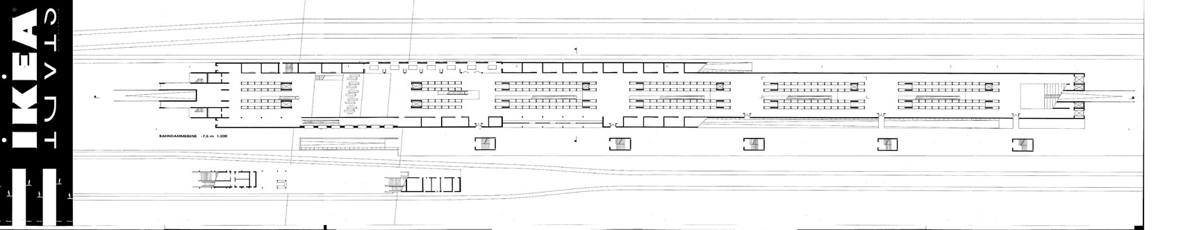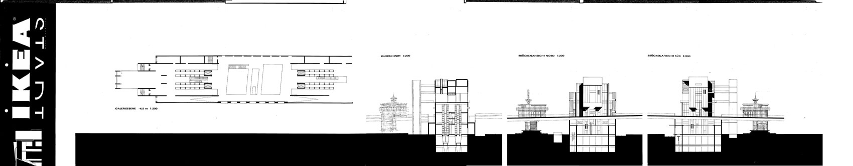 Berlin Westend, an der Spandauer Damm Brücke zwischen S-Bahnring und Stadtautobahn. 4.000 qm Showfläche über den Gleisen. 85.000 qm Hochregallager. 4000 qm experimentelles Wohnen. Warenlogistik zu 80 % über dem Schienenverkehr. Experimentelles Wohnen oberhalb der Möbelausstellung. Studie 1997
