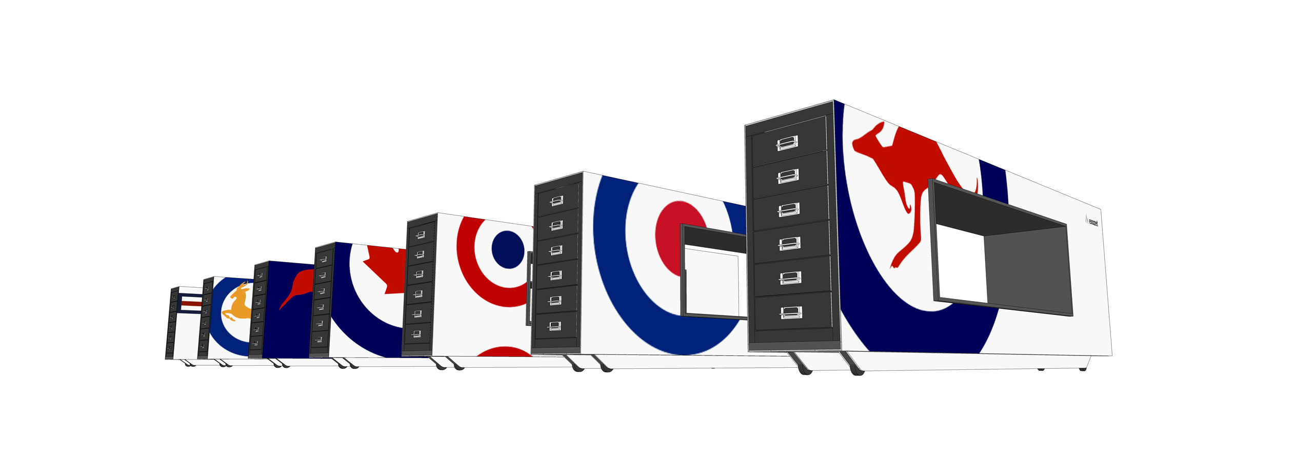 Das Chassis, ist eine bedruckbare, sich selbst stabilisierende, gefaltete Konstruktion. Das Möbel nimmt zwei handelsübliche Bisley-Stahlschränke auf. Durch das Möbel wird arbeitsplatznahe Ablagefläche gewonnen. Dies verkürzt Wege am Arbeitsplatz und trägt zur akustischen Beruhigung bei. Geplant für den Einsatz im ehemaligen Flughafen Tempelhof.